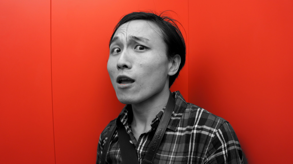 在電梯裡剛好旁邊都是紅色的!!就玩起了去色的濾鏡,唷!!用在巫弟身上效果不錯耶!! |